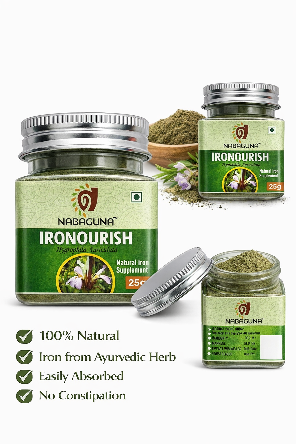 NABAGUNA Ironourish is a plant-based natural iron supplement prepared from Kulekhara (Hygrophila auriculata), a traditional Ayurvedic medicinal herb widely valued for its nutritional and therapeutic benefits. Known for its natural iron content and micronutrients, Kulekhara has been traditionally used to support healthy blood levels, improve vitality, and promote overall wellness.